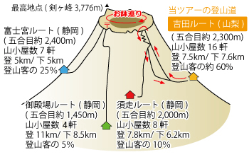 ・富士登山はルート(吉田・富士宮・御殿場・須走)にかかわらず、入山料(通行料)4,000円が必要です。旅行代金には含まれておりませんので各自にて手続き(お支払い)をしていただきます。なお、富士山保全協力金制度(任意1,000円)は廃止となりました。 ・富士山の天候は非常に変わりやすく、急きょ雨に見舞われる場合があります。雨具をお持ちでない場合は、途中リタイアしていただく場合があります。・雷、強風などが続く場合、それ以上の登山を中止する場合があります。その場合でも返金などは一切できませんのでご了承ください。 ・五合目で標高2,300mを超えています。空気が薄く、高山病になる恐れがありますので、当日は睡眠不足、二日酔いなどないよう体調の管理に十分気をつけてください。万が一高山病(頭痛・吐き気)になってしまった場合は速やかに強力にお伝えください。症状次第では、リタイアを勧告もしくは、強制的にリタイアしていただく場合があります。 ・富士山では五合目以降はトイレはすべて有料(100円~200円)です。必ず小銭をご用意ください。 ・富士山では水道がありません。そのため、水が貴重ですべて有料となります。飲み水以外の利用分も計算してご準備ください。 |