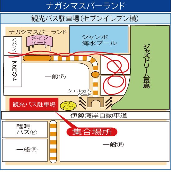 新大阪(7:40発) ↓ バスナガシマファーム(10:40頃着) ※到着後、いちご狩りを40分間お楽しみください。いちご狩り終了後、 ツアーバスにてナガシマスパーランド観光バス駐車場までお送りいたします。 その後、遊園地、湯あみの島、隣接するアウトレット等でお楽しみ下さい。 ナガシマスパーランド(17:10発) ↓ バスJR大阪駅周辺(19:40頃着)