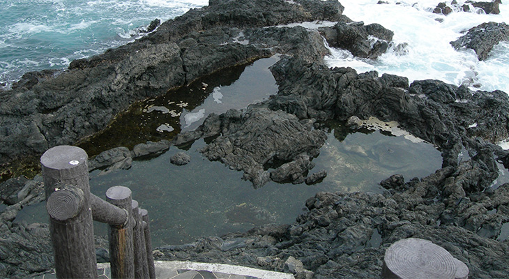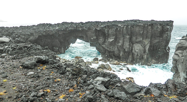 波で浸食された溶岩。2つのアーチでしたが、昭和37年の噴火の地震によって片方が崩壊してしまい、片めがねとなっています。岩の間からは沖合にある岩礁・三本岳が望めます。