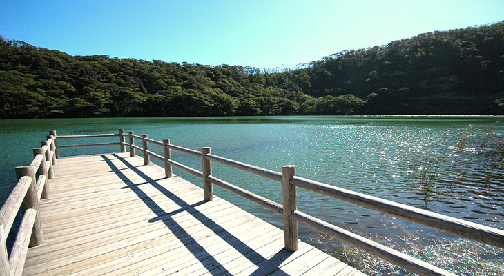 島内で唯一の湖で、原生林に囲まれた周囲約2kmの火口湖です。国の天然記念物「アカコッコ」や「カラスバト」などさまざまな野鳥を観察することができるバードウォッチングポイントです。
