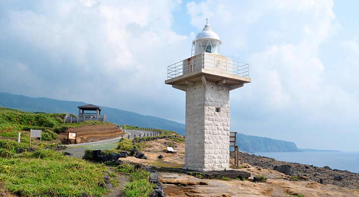 石造10mほどの小柄な灯台。三宅島の夕景撮影スポット伊豆岬に建っており2009年6月に100周年を迎えました。天気がいい日には新島・神津島や遠く富士山を眺めることができます。