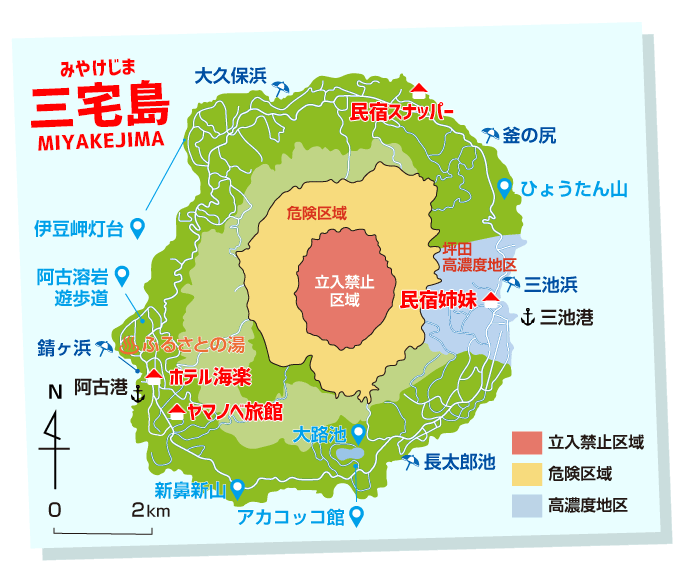 三宅島は富士火山帯に含まれる活火山。2000年の噴火をはじめ、遡ると1983年阿古地区と約20年周期で噴火を繰り返しています。2013年7月より火山ガスマスク携行義務付けが緩和されました。