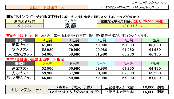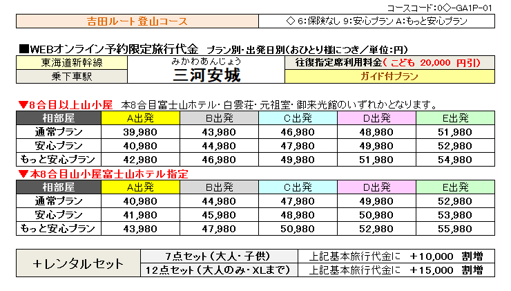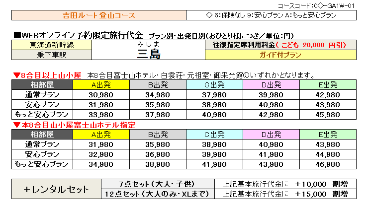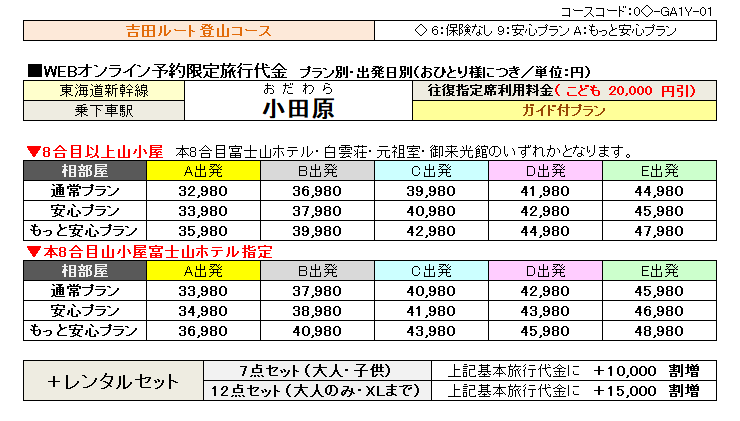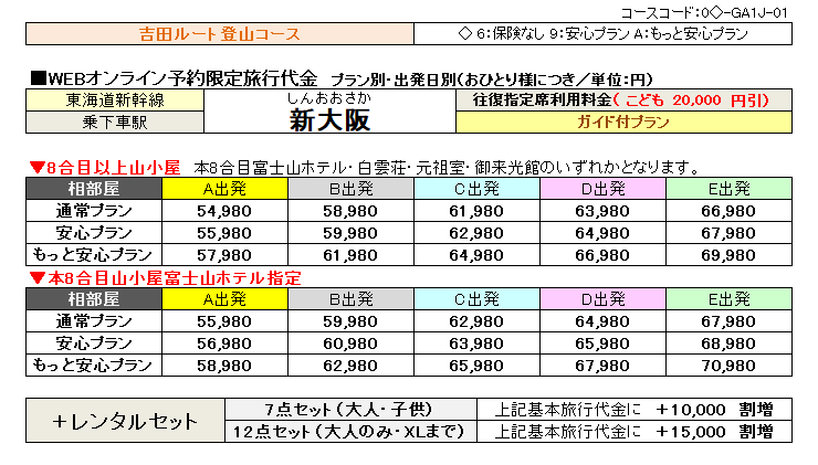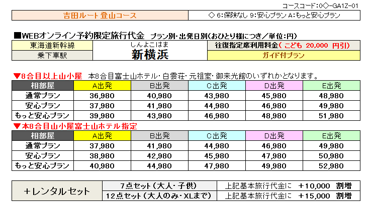 | ツアーに含まれるもの | 往復新幹線チケット、乗継駅から富士山五合目までの往復貸切バス料金、山小屋宿泊費(行程に記載の食事)、入浴施設での入浴・昼食代、その他スケジュールに記載の食事、富士山専任登山ガイド料金(ガイド同行プランの場合のみ)、消費税等諸費用 |