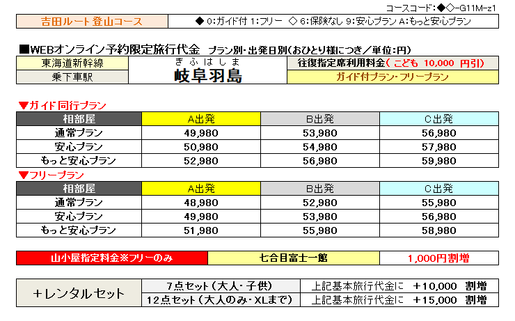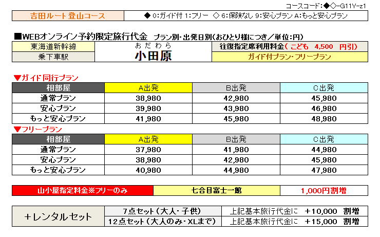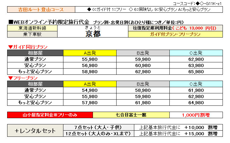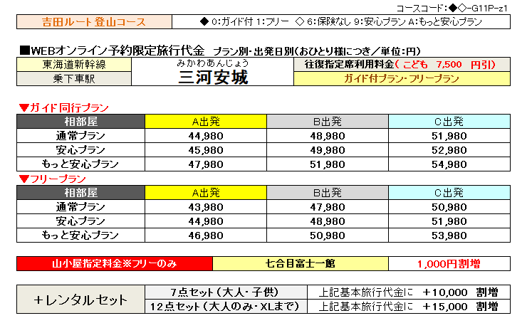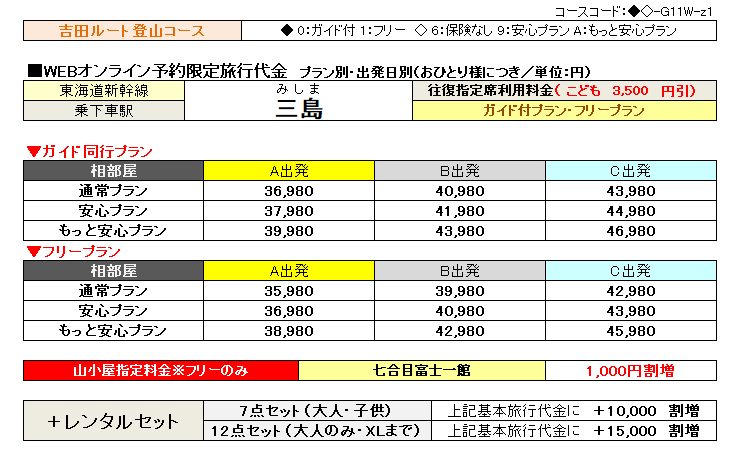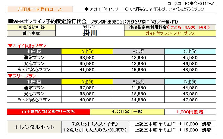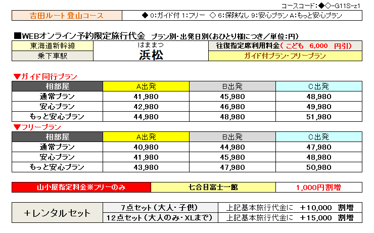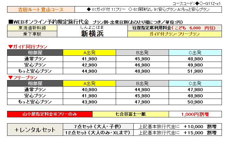 朝まできっちり就寝 山小屋前でご来光後/出発…登山(ガイドと共に約5~6時間)…吉田口頂上(休憩) ※通常ガイド付は山小屋から頂上まで:約4時間 → 当プラン約5~6時間 ※お鉢巡りオプションなし 下山(ガイドの指示で約4~5時間)…吉田ルート・富士スバルライン五合目 ※通常ガイド付は頂上から五合目まで:約3~4時間 → 当プラン約4~5時間 富士山五合目(吉田口)(17:00発)===富士スバルライン(乗換専用シャトルバス)=== ===入浴施設(入浴/夕食・約100分)=== ===JR新富士駅(20:40頃)===JR富士駅(20:50頃) 新幹線/新富士駅---<新幹線>---各地着 |