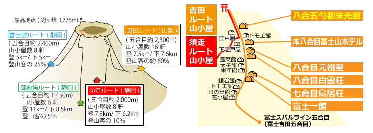 ・富士登山はルート(吉田・富士宮・御殿場・須走)にかかわらず、入山料(通行料)4,000円が必要です。旅行代金には含まれておりませんので各自にて手続き(お支払い)をしていただきます。 ・吉田五合目にあがる富士スバルライン、富士宮五合目にあがる富士山スカイラインは、マイカー規制により自家用車は通行できません。路線バスまたはタクシーのご利用となります。 ・安全に登山ツアーを遂行するために、現地職員や係員(富士登山専任ガイド・係員・山小屋職員・安全指導センター職員など)の指示には必ず従ってください。 ・特に年齢による制限は設けていませんが、お子様や高年齢の方などご遠慮いただく場合があります。 ・15歳未満(中学生以下)の方だけでの参加はお受けできません。16歳以上(高校生以上)であっても未成年の場合は親権者の同意書が必要です。 ・お客様の装備の不備により、当日強力(富士登山専任ガイド)・添乗員・係員・山小屋・安全指導センターなどの判断で強制的にリタイアさせていただく場合があります。その場合、返金などには一切応じることはできませんので予めご了承ください。 ・台風など強風の場合は宿泊施設を閉める場合があります。その場合は事前にご連絡いたします。