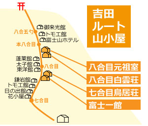 | 山小屋出発(0:30頃)… …各自で登山(約4時間)… …吉田口頂上(休憩・朝食弁当・ご来光)… …各自下山開始… …(下山約3~4時間)…五合目 |