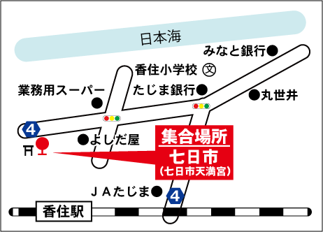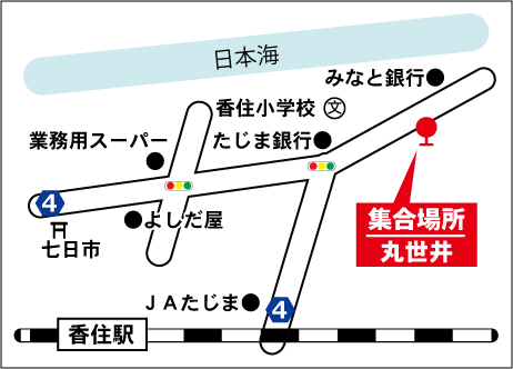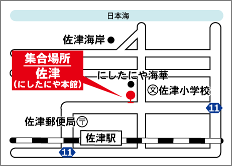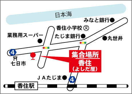 佐津(9:30)⇒海華(9:31)⇒佐津海岸(9:32)⇒柴山(9:40)⇒沖の浦(9:42)⇒今子浦(9:44) ⇒三七十館(9:46)⇒丸世井(9:50)⇒香住(9:52)⇒七日市(9:53)⇒下浜(9:55)⇒さどや(9:56) ⇒かに市場/休憩(10:30頃) ⇒ 出石/休憩(オプション昼食出石そば1,000円)(12:30頃)⇒ ⇒但馬まほろば/休憩 ⇒ めんたいパーク/休憩 ⇒梅田(16:00頃着) ⇒ 天王寺(16:40頃着) |
