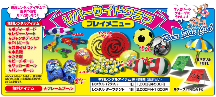 ①お手軽海の家利用(往復バス+海の家着替え・荷物預かり+リバーサイドクラブ利用) 4,980円②海の家利用+ランチそーめん流し(①+ランチそーめん流し) 5,580円