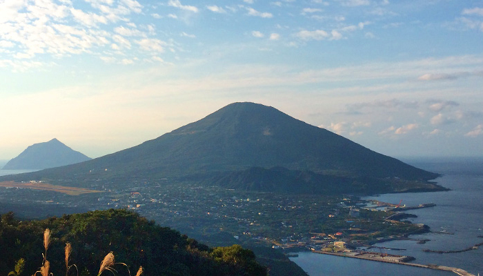 「ひょうたん島」八丈島を形成するもう一方の山。八丈島にある2つの山の1つ、別名「東山」。標高は700mで、10万年以上も前に誕生した山です。写真は三原山からの八丈富士・八丈小島の展望です。