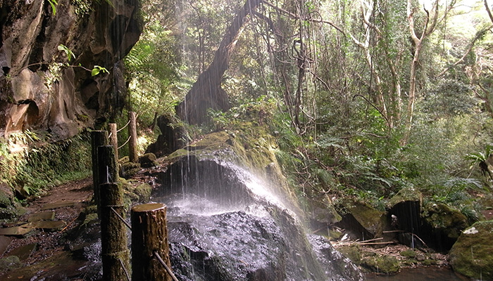 島内最大級の大きさを誇る滝。落差約36m、コケが覆う緑の岩肌を水煙をあげながら流れ落ちます。唐滝遊歩道駐車場から先は片道約1時間、約1.2kmのハイキングとなります。