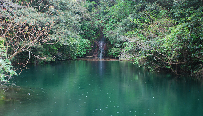 硫黄沼は室町時代に作られたため池。水中に硫黄が溶け込み、天候や季節により水面が様々な色に変わります。沼の奥には写真にも写っている小さな滝があります。