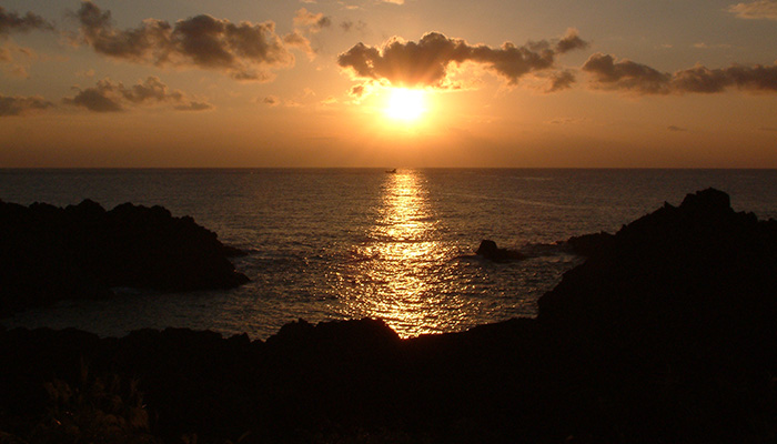 夕日と海が最高のロケーション。八丈富士が噴火した際に、その溶岩が流れてきて形成された溶岩台地です。黒々とした玄武岩が幅100m長さ500mにわたって広がっています。