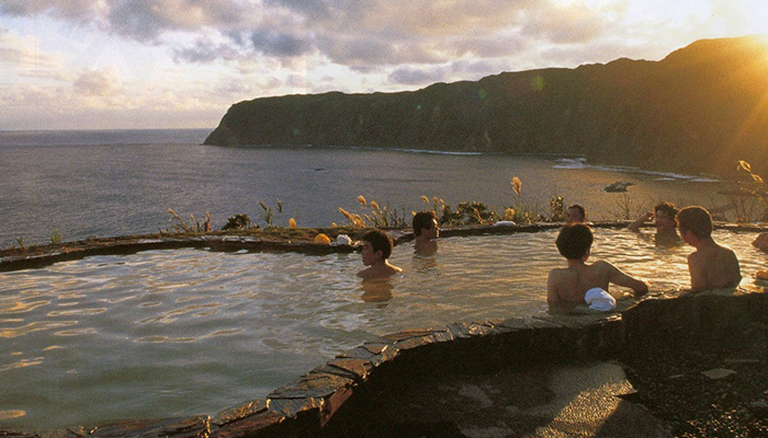 南国情緒あふれる「常春の島」八丈島。海は透明度抜群で、ビーチやダイビングポイントも多数。絶景の「みはらしの湯」にジャングルの中の「裏見ヶ滝温泉」など、個性豊かな7つの温泉をもつ温泉島でもあります。