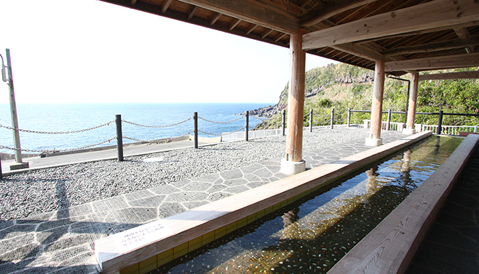 温泉天国・八丈島内唯一の足湯。藍ヶ江から太平洋を展望でき、1月には水平線に沈む夕日などを楽しめます。海のきらきらとしたイメージから「きらめき」という名前がつけられました。