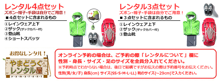 | レンタル付プランの方は | 1日目の夜、花の湯でレンタルセットをお渡しします。ご返却もお帰り時の花の湯となります。レンタルをご希望の場合はレンタル付でお申し込みください。 |